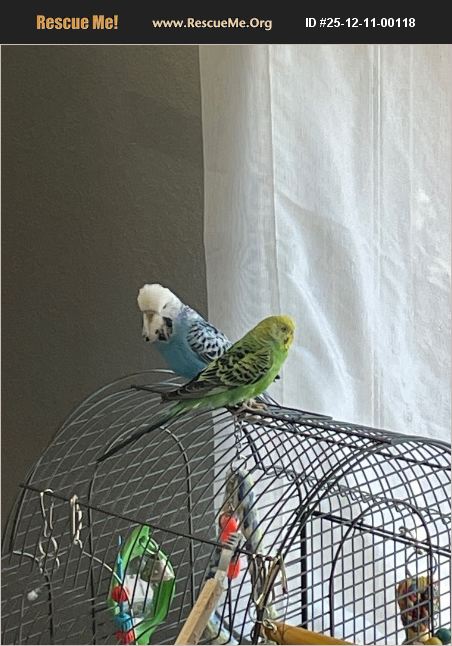 Hi, this is Bubbles (blue). We got him in March 2021 from a breeder. He is an English budgie so even though her is large than Honey (green in the picture) he is almost a year younger. He is not tame at all. We are out of the country a lot during summer so we never had the bird too tamed so they can be on their own. We are traveling more and more so we think they need someone who can give them more attention. He follows Honey in everything and we hope they can be adopted together.