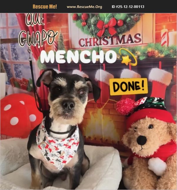 Hello, my name is Mencho . I am a three year old male schnauzer mix. I was Surrendered by my family , looking for a new forever home who will never ever give up on me again. I am great with other dogs love all people little and big . I prefer to be in home with other dogs so I can play with , nap , lay in the sun , take daily walks and play in the yard . I am available now. All I want for Christmas is a family .