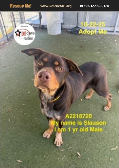 Urgent!!! this adorable young guy will be killed on 12/18 for SPACE!!! Please save him!! Transportation information is available, contact Bonnie below. SLAUSON, A2218720 - NEUTERED MALE, BROWN AND TAN DOBERMAN PINSCHER. Shelter: SOUTH L.A. Age: 1 YR, 3 MOS Weight: 72 LBS. Scheduled Euthanasia Date: 12/18/2025. This animal has been at the shelter since 09/01/2025 and on this list since 12/11/2025. Reason for euthanasia: Capacity!!! Last day to take animal: 12/17/25! Scheduled euthanasia date:12/18/25!