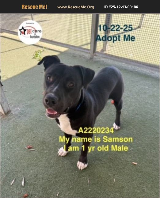 Urgent!!! this handsome young boy will be killed for SPACE on 12/18!! Please save him!! Transportation information is available, contact Bonnie below. SAMSON, A2220324 - MALE, BLACK AND WHITE LAB/AMERICAN PIT BULL TERRIER. Shelter: SOUTH L.A. Age: 1 YR, 3 MOS Weight: 75 LBS. Scheduled Euthanasia Date: 12/18/2025. This animal has been at the shelter since 09/10/2025 and on this list since 12/11/2025. Reason for euthanasia: Capacity!! Last day to take animal:12/17/25! Scheduled euthanasia date:12/18/25!