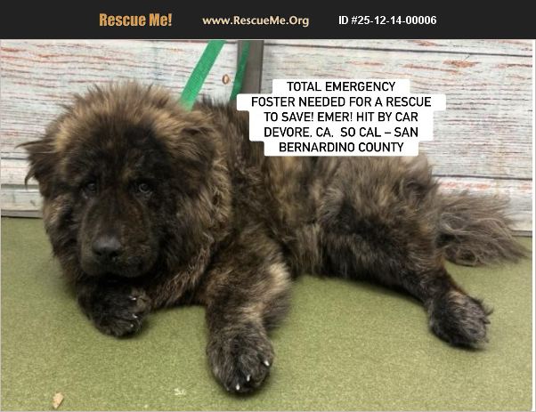 Courtesy Posting: TOTAL EMERGENCY- FOSTER (local foster immediately needed, even shorter term, as well as longer term foster post recovery) NEEDED FOR A RESCUE TO SAVE! EMER! HIT BY CAR- friendly with staff per shelter and stable, but needs surgery (Rescue group to provide) DEVORE, CA, So Cal - SAN BERNARDINO COUNTY ANIMAL CARE - ID #A834315 'CHOW MANE', an ADORABLE, YOUNG CHOW X BOY EXPECTED TO BE ADDED TO EUTHANASIA LIST WHEN HE COMES OFF HIS STRAY HOLD ON OR ABOUT 12/16. He is Rescue only, but rescues need a foster home to save and have him recuperate at. Shelter says, 'A834315 Chowmane! This guy into the shelter yesterday as a stray from the Newberry Springs area after a call came in reporting that that he was hit by a car and assumed to be deceased. Fortunately, he is doing ok but does have a fractured left humerus and is rescue only due to the prolonged recovery of the fracture. Medical notes state 12/12/25 Vet: Fracture of left humerus. Rx: Amoxi/clav 500mg 1 BID x 10 days - Carprofen 100mg 1/2 BId x 10 days.' Chow Mane was taken to a local vet following animal control responding to the call and finding him actually alive, and did xrays and prescribed pain medicine. He has been estimated to be 2 years old, and he has a beautiful brindle coat and fluffy tail. With surgery, his prognosis is good, and he could live a wonderful, long life. We believe he may be related to Hershey, an almost identical looking chow mix who was found as a stray and ended up at this same shelter about 45 days ago and was estimated to be the same age. Hershey was rescued and has a wonderful disposition (friendly with all dogs, people and even cats) and ahs already found his forever home. Chow Mane is shown in video we just obtained with a similar gentle and sweet disposition. Unfortunately, Chow Mane has already been made 'Rescue only' though, meaning only a rescue group can pull him out of the shelter (he cannot be adopted directly from the shelter at this time ( you need to go through a rescue group to save him). However, rescues need fosters and a place for a dog to go. We need a foster right now (can even be short term), as well as longer term and post surgery so he can recuperate. Any foster likely needs to be local or local enough to a willing rescue, unless a longer foster may want to also adopt. Rescue groups also need pledges for his medical since surgery will ne expemsive. Therefore, we are desperately looking for a chow savvy home, or foster and or rescue to save Chow Mane in time. Since rescue groups need a foster to save him, if you are interested in fostering, or fostering to adopt, or donating towards his medical needed, please contact [email protected] asap or Southern California Chow Chow Rescue Network who is trying to assist with his placement, and we can try to pair you with a rescue to help or foster or adopt through. For rescue inquiries, please contact the shelter asap at (909) 386-9820 and provide his ID, and also email [email protected] Listing link is: https://24petconnect.com/DetailsMain/SBCO1/A834315 We will also be posting updates, additional pictures and videos on facebook as we receive such: https://m.facebook.com/story.php?story_fbid=10168204848678125&id=783968124&mibextid=wwXIfr Note; to view contents of links you will need to copy and paste each one separately into your browser.