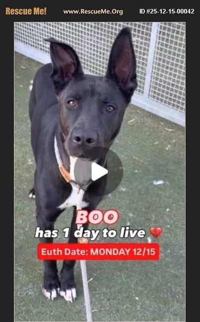 https://www.instagram.com/reel/DSO0nOnDnsc/?igsh=NTc4MTIwNjQ2YQ== Boo is estimated to be 3 years old and was picked up as a stray in October. She was noted to be a little nervous, but easy to handle when she arrived. When we first met her, she was timid, but warmed up with the help of treats. Soon her happy, fun, super sweet personality came out! She was very affectionate and energetic. She would get jumpy when excited but corrected easily. She wasn't interested in toys, but loved treats. She was also bathed by the groomer who said she was well-behaved, just a little nervous. Boo has gone into playgroup several times and is always described as social around the other pups. She can be assertive and high energy, but settles after some time. Boo is a very nice girl who deserves a loving family! Sadly, our new friend is now ALERTED & DEADLINED for 'unsafe behavior.' While she's been friendly in her kennel towards us, she has a few negative kennel notes from supervisors and can be jumpy and mouthy. She must be fostered, adopted, or rescued by MONDAY 12/15 at 8AM to ensure her safety. We hope her hero is out there! Adoptions must be done in person by end of day Sunday since the shelter is closed to the public on Monday. Fosters and rescues, please email all contacts below if you can help her! She's waiting at South LA Shelter.