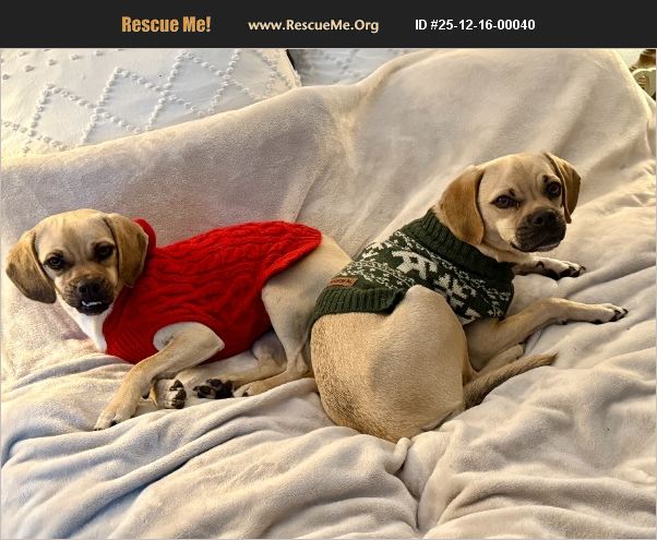 Penny and Parker are a brother and sister Puggle pair! Penny is in the red sweater and Parker is the male wearing green. They are about 1Y and 9 months bonded pair and should be adopted together. They love kids and other dogs! Up to date with their vaccines and are spayed and neutered. They are crate trained, very chill and happy. Please consider adding this brother and sister pair to your home!