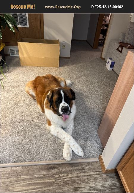 Hugo is a handsome, 130lb Saint Bernard looking for his new forever home. At 8 years old, he is the perfect mix of a loyal protector and a goofy best friend. Raised on 10 acres by a single owner, he is exceptionally well-behaved with both children and adults. He is quiet in the house, trained to stay off furniture, and surprisingly low-shedding! Hugo's absolute favorite things are snow, ice cubes, and long walks where he can roam. He's a smart boy who learns quickly and is very low-maintenance-he's happy napping on a cool floor near an air vent and eating on his own schedule. If you're looking for a big, fluffy companion who is as sweet as he is brave, Hugo is your guy!