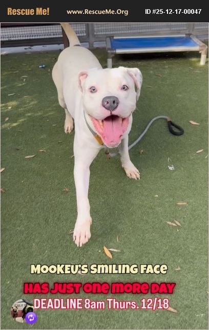 https://www.instagram.com/reel/DSWpNrdEdgF/?igsh=Mzc3ZTVlOWMwZA== Mookeu has a face that stops you in your tracks, and quite a personality to match. We adore him entirely. I can't figure out why he's been overlooked. He's engaged, fun, goofy, friendly and so young- even in his kennel his exuberant spirit is heart melting. But because the shelter has so many dogs, Mookeu's number is up, alerted to create empty kennel space. That's it! On top of that, he caught that URI bug at the end of November. He was stuck in his kennel until we got to interact again this past weekend, and Mookeu's smile is as infectious as ever. He's not medically cleared, but looking better, minimal symptoms. He's so resilient. He was caught as a stray in September, with a catchpole that led to him biting the pole and being injured. But this sweet boy didn't hold a grudge- he's been great with interactions with staff and volunteers. When bathed by the groomer, it went well, and Mookeu was a playful, good listener. Playgroup notes describe him as social, selective, a rowdy player, steerable, and some sexually motivated mounting (not yet neutered). He can be obnoxious at times. He started out with a muzzle due to gate greeting, but not needed anymore. Mookeu is such a good boy, he is available for adoption, shelter foster, or rescue.