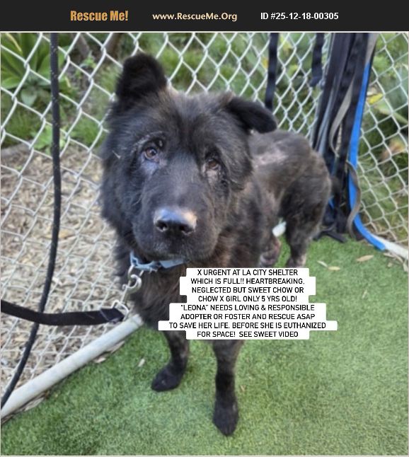 Courtesy Posting: CODE RED- placed on Euth list sadly UPDATE- MUST BE PULLED BY SUNDAY 12/21/25 BY 4 PM- on meds for URI again X URGENT AT LA CITY SHELTER WHICH IS FULL - LOS ANGELES ANIMAL SERVICES- SOUTH LOS ANGELES SHELTER- HEARTBREAKING, NEGLECTED but SWEET CHOW OR CHOW X GIRL ONLY 5 YRS OLD!- 'LEONA' ID #A2242847- gives kisses, and did well with other dogs. NEEDS LOVING AND RESPONSIBLE ADOPTER OR FOSTER AND RESCUE ASAP TO SAVE HER LIFE, BEFORE SHE IS EUTHANIZED FOR SPACE! See sweet videos. Help! This LA City shelter is full, and this poor girl was found as a stray in horribly neglected condition, missing much of her fur, and brought to the shelter on 11/5. Leona has been estimated to be only 5 years old, though. and weighs 56 lbs, and was previously spayed. The shelter told us, 'She arrived with missing hair and the medical staff were only able to do a limited examination due to her fear/anxiety/stress. There are no additional updates to the medical record other than being treated for the skin condition and a URI. Once her URI is resolved, she may possibly be eligible for a playgroup outing.' On 11/25, she finally was let out of her kennel to the playyard and was noted as keeping to herself, but socially tolerant, took appropriate corrections, and had a gentle and dainty playstyle. Back in her kennel, she greeted staff with a tail wag and approaching the fence as can be seen in video they just provided. On 12/3, they provided us with 2 more videos in the play yard and she was enjoying pets, as well as giving kisses on the face. Leona also did well and mostly ignored all the active dogs around her, both large and small. The shelter also let us know that on 11/23 they gave her Baytril for a minor URI. Her skin has improved a bit since being treated. We are now looking for a loving home or foster and rescue for her to save her in time. The shelter is over capacity and just put 7 more dog's on deadlines due to space, so Leona needs out asap. The listing link has been copied into the comments section of this post. She can also be fostered locally if in the shelter's area. Please contact the shelter directly by calling or using the listing link, or by calling (888) 452-7381. If you can foster, but are further away or not in the shelter's jurisdiction, please also contact [email protected] asap or Southern California Chow Chow Rescue Network who is trying to assist the shelter with her placement. Please note rescue groups typically need a foster to save any dog. We will then try to pair you with a willing rescue group in time. We will be posting her on facebook and any new updates and pictures and video as we receive such at: https://www.facebook.com/debbie.alder.14/posts/10168143253488125 Note: so view contents of links you need to copy and paste each one into your browser separately