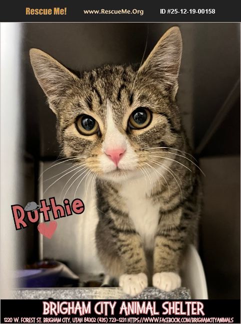 Hi there, I'm Ruthie! I'm a 6-month-old female Tabby Domestic Short Hair, and I'm ready to find my forever family! I may be young, but I already know exactly what I love most in life: being sweet, snuggly, and soaking up all the affection I can get. The humans here say I'm extra lovable, and I'm inclined to agree. I adore gentle pets, soft voices, cozy naps, and anyone who wants to be my friend. I have a calm, tender personality and would make a wonderful companion for someone looking for a loving little shadow. My adoption fee is $160, which includes a spay voucher to help me start my new life healthy and happy. I can't wait to curl up in a safe, warm home where I can purr my way into someone's heart. Adoption Information All adoptions are upon approval of the adoption application only Shelter Hours: Tues-Fri 12-6pm Brigham City Animal Shelter 1220 W Forest St, Brigham City, UT 84302 (435) 723-1231 Brigham City Animal ShelterFacebook Page: https://www.facebook.com/brighamcityanimals