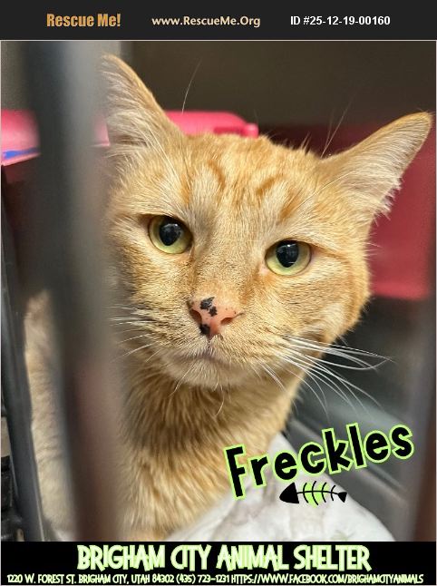Hey there, I'm Freckles! I'm a 2-3-year-old male Orange Tabby Domestic Short Hair, and yes, my name fits me perfectly! I've got the cutest little freckles on my nose, and they're kind of my trademark. Everyone notices them right away. I'm also a big talker. I love chatting with my humans, telling you all about my day, and asking for pets with my sweet meows. And just when you think I couldn't get any cuter�'�| I'm also a biscuit maker extraordinaire! Whenever I'm happy and content, I knead away like I'm baking fresh bread just for you. I'm super friendly, people-loving, and full of charm. If you want a social, affectionate kitty who loves conversation and baking sessions, I might be your perfect match. I'm not neutered yet, but my adoption fee is $140, and it includes a neuter voucher to help me start my new life healthy and ready for a forever home. If you're looking for a sweet, talkative, biscuit-making orange boy with plenty of personality, come meet me! Adoption Information: All adoptions are upon approval of the adoption application only Shelter Hours: Tues-Fri 12-6pm Brigham City Animal Shelter 1220 W Forest St, Brigham City, UT 84302 (435) 723-1231 Brigham City Animal ShelterFacebook Page: https://www.facebook.com/brighamcityanimals See less
