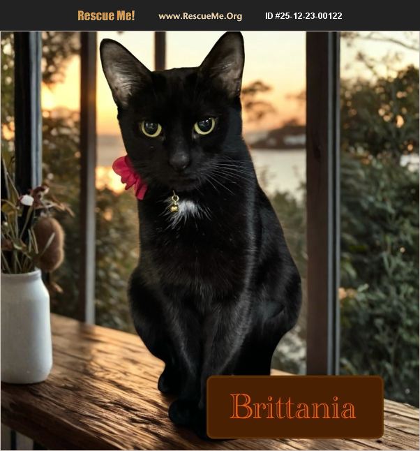Brittania is a beautiful, sleek black mama cat about one year old with a graceful presence and a heart full of love. She was rescued from Craigslist after doing her very best job raising her babies, and now it's her turn to be spoiled. This sweet girl is affectionate, gentle, and enjoys being close to her people. Brittania thrives on human attention and would do best as an only cat, where she can soak up all the love without competition. She's calm, loving, and ready for a quiet, cozy home where she can finally relax and just be someone's cherished companion. If you're looking for a loyal, elegant, and loving cat to be your one-and-only, Brittania may be your perfect match.