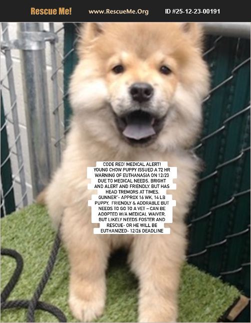 Courtesy Posting: CODE RED! MEDICAL ALERT! YOUNG CHOW PUPPY ISSUED A 72 HR WARNING OF EUTHANASIA ON 12/23 due to medical needs, bright and alert and friendly, but has head tremors at times DOWNEY, CA (S CAL)- LOS ANGELES COUNTY ANIMAL CONTROL- DOWNEY- ID #A5745625 - 'GUNNER'- APPROX 16 WK, 14 lb PUPPY, FRIENDLY AND ADORABLE BUT NEEDS TO GO TO A VET - CAN BE ADOPTED W/ A MEDICAL WAIVER, BUT LIKELY NEEDS FOSTER AND RESCUE- OR HE WILL BE EUTHANIZED- 12/26 DEADLINE Please help us find a responsible, loving and forever home who has the means to get and provide vetting, or foster and rescue to save this young boy the Downey shelter has estimated to be only 16 weeks old and weighs 14 lbs at intake on 12/20. Fondly named Gunner, he was found/brought in as a stray so the shelter unfortunately has no prior background on him. The shelter describes him as 'Gunner is a happy, friendly boy with an upright, relaxed, and wiggly body who eagerly approaches for attention. His neutral ears, soft eye gaze, and long, soft lips show his gentle, easygoing nature. With a Low Fear-Anxiety-Stress level (1), Gunner is confident, social, and ready to be a loving companion *Gunner is okay to go out on a trust and health waiver due to Neurological issues, CIRDC (Kennel Cough), & Pulmonary Disease* They further noted, 'There are multiple possible causes for the symptoms observed, and he requires further diagnostic workups beyond what the shelter is able to provide. Videos documenting his condition have been uploaded to the Trello link, where they can be viewed and downloaded at https://trello.com/c/UIX8W6c9 At this time, he is bright, alert, and eating; however, he is exhibiting head tremors and instability when walking. Potential concerns include neurological conditions, distemper (test results are currently pending), other infectious processes, pulmonary disease, or additional underlying issue.' We also have a complete set of medical behavior notes upon request. To adopt this dear puppy, please contact the shelter directly to adopt by calling 562-940-6898 asap and reference his applicable ID. If you are interested just to foster, or if you need further help, please contact: [email protected] or Southern California Chow Chow Rescue Network asap as we are trying to find fosters we can then refer to a rescue group to save Gunner. Rescue groups should email us and the shelter at: [email protected] and note his ID and your intent to rescue. We will be posting additional information updates, pictures and video as we receive such on facebook at: https://m.facebook.com/story.php?story_fbid=10168252635293125&id=783968124&mibextid=wwXIfr Note: to view contents of links you will need to copy and paste each one separately into your browser.