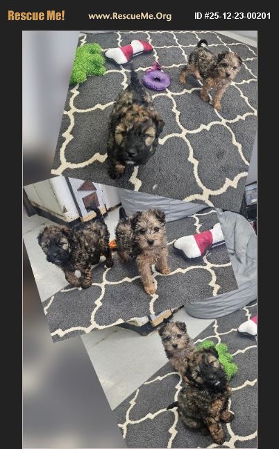 These little boys are a Wheaten/poodle mix. They are currently just 7.5 weeks old. They will not be available to go home until they are atleast 9 weeks old. These boys are very small at around 4 pounds. We believe the dad was a miniature poodle. They owners of the mommy dog said their neighbors male poodle got into their yard and the outcome was these 2 babies. They did not want puppies and so they called rescue as to take them. The boys do have a natural long tale. If you are interested in adopting please text or email us to request an application. The adoption fee is 425.00 easch.