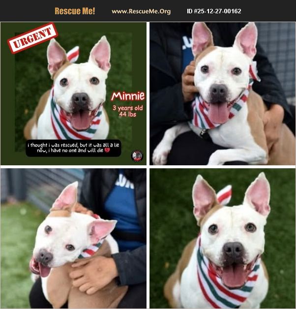 Here is minni's you tube link cut and paste into browser, shows her beautiful spirit, No more extension will be murdered TODAY, will not see New Years Day . https://youtube.com/shorts/pIhbu3u6q1c?si=nBDGYluvnthWDHmJ: URGENT MINNIE ABANDONED AGAIN by a foster This is not a feel-good holiday post. This is the brutal truth behind rescue work that nobody wants to talk about. Minnie was promised a home for Christmas. A foster to get her out of the kill shelter , the day of transport the foster ghosted . Now Minnie will die if the rescue does not get another placement . She believed it. We believed it.And then days before the holiday the adopter vanished. No call. No explanation. No goodbye. Just silence. And silence in the rescue world kills. Because when one dog doesn't leave as planned, another dog loses their chance to live. Kennels are finite. Space is finite. Lives are not. Yet they are treated like they are disposable. Applying to adopt a dog is not casual. It is not a placeholder. It is not something you do to feel like a hero on paper. We have seen: humans who disappear without a trace leaving an innocent animal to die for a crime they didn't commit. Minnie is the one suffering for it. She came in as a stray. Already scared. Already stressed. Then she opened her heart again for a human who never deserved her trust. Minnie 3 years old | 44 lbs No bite history Sick (kennel cough complex) Easy treatable Terrified in the shelter Blossomed beside a female dog Thought life couldn't get worse then Christmas heartbreak struck. She doesn't need much. She needs a real hand to hold hers this time.A safe couch. A quiet exhale. A chance to heal. A chance to live If you are ready to foster or adopt, please Be her miracle. Be her safe place. Be the reason she survives this story. Text Kat 516 4573678 Call/Text: 917-689-8414 Email: info@amsterdog Apply: AmsterDog Shelter: NYC ACC With every ounce of hope and fight left in me, Kat Run to the Rescue Where love and peace will follow
