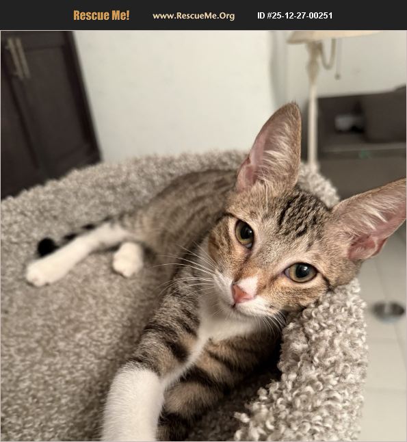 Teddy is 4 months old tabby white kitten with distinctive dark markings. His is very slim, long-legged boy with triangle shaped head. His fur is very short and slick. Teddy is a sweetheart. Loves to be pet and is very gentle around people and other animals. He likes to play but has mild personality. Will make a great friend for any type of family.