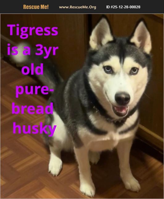 Tigress is a beautiful 3 year old pure bred husky. She was born on October 16th. Tigress is a social butterfly very outgoing, energized, friendly dog curious about everything very playful she loves going for walks, playing in the snow. She loves playing tug-of-war with you with her toy and catch. She also love swimming. She loves pup cups and she look forward to them. She's good with kids and also other dogs. She's very affectionate she likes to cuddle. She's very adventurous but at the same time can be a couch potato. She is not spayed yet. She is in good health otherwise.