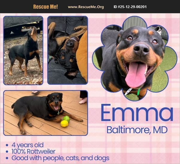 MEET EMMA ��%90%BE Baltimore, MD | Contact Rachel at 309-660-2372 or use the link at the end of this post to apply. 4-year-old spayed female Rottweiler | ~100 lbs | Sweet, social, and affectionate Emma is a beautiful, full-blooded Rottweiler with a heart as big as her paws. She's a loving, loyal companion who thrives with people and is happiest when she's part of the family-preferably curled up next to you for a long cuddle session or soaking up belly rubs. Emma loves: �'ۢ ��ե People and affection �'ۢ ��%90� Playing with other dogs (with proper introductions) �'ۢ ��%90%BE Doggie daycare and social play �'ۢ ��Z%BE Chasing balls and running around �'ۢ ���S Swimming-she loves the water �'ۢ ���ܕ�%8F Lounging indoors as a true house dog She is fully vetted, spayed, microchipped, up to date on vaccinations, heartworm negative, and on monthly Simparica Trio. She has no ongoing medical issues and is overall a very healthy girl. Personality & Home Life Emma is housebroken, has free roam of the house, and has excellent manners indoors (especially if food isn't left out). She knows basic commands like sit, lay down, stop, and paw, and she enjoys learning-though she would benefit from continued leash training, as she can be enthusiastic and strong on walks. She does best when introductions are done properly and can be a bit 'barrier defensive' in kennel settings, meaning she may bark behind fences or barriers-but once she's out and engaged, she's friendly and affectionate. At the vet, she does best when handled by staff without her owner present and gets rave reviews for her behavior. Emma is social with: �'ۢ ��ӕ�%8F Male & female dogs �'ۢ ��ӕ�%8F Cats (she may grumble if they approach her food, but has never snapped) Ideal Home Emma would thrive in a home with: �'ۢ ��%8F� An experienced dog owner (Rottweiler experience a plus) �'ۢ ��Ԭ�'�%8D��ԩ�'�%8D��Ԥ Older children or adults only �'ۢ ��Z� Willingness to continue basic training and leash work �'ۢ ���� A family who wants a devoted, affectionate companion Due to her size and enthusiasm, Emma is not the best fit for a home with very young children, as she can be rambunctious and unaware of her strength when excited. She has never shown aggression, but her next home should allow her the space and structure to succeed. Emma is located in Baltimore, MD, but transportation can be arranged for the right home.