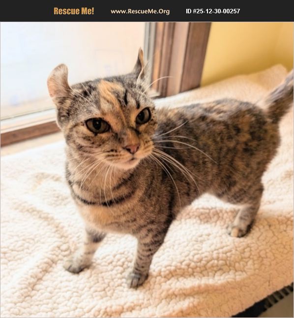CURLY SUE is a darling TORBIE AMERICAN CURL. She is between 1 and 2 years old, spayed and has her claws. She has a very pretty, easy short coat and bright gold eyes. Her unique ears curl backwards. She and several other cats came from a home where they were loved but the owner was unable to keep them. Curly is actually a very fun little cat and her foster home thinks she's a real hoot. She is VERY busy, flirty and playful. She is currently living with two other cats and other than being a bit bossy with them as a female with an agenda she does just fine. She is friendly, intelligent and is a very unusual breed we rarely see. The best home for Curly would be cat experienced and used to breeds such as Abyssinians, young Siamese, and Bengals. She is NOT a couch potato and loves to run and play rather than sit placidly on a lap. She would be good for another young (probably male) cat that would let her be the boss. No kids please but a cat friendly dog might be ok as she is very self confident. ADOPTION FEE $175. FOSTERED IN KENOSHA, WI