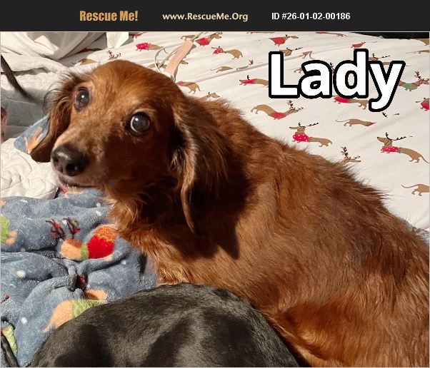 Lovely Lady is a sweet 9 year old girl looking for love and a forever home. Lady is around 17 pounds, and is working on her waistline with the help of her foster mom in Ohio. Lady is crate trained, and she is working on her house training. Like all dachshunds she requires a regular schedule. All rescue dogs go through a period of adjustment so understanding and patience is important. Lady is a calm, laid back submissive girl who loves to go for walks and play with her toys. She loves to cuddle and snuggle and give kisses. Lady is good with children and other dogs, but has not been tested with cats. She would love a home where she could have someone home with her most of the time, and where she would be able to sleep in the big bed every night. Lady is a sweet, loving darling who deserves a happily ever after. Will you be the one to open your arms to this lovely girl?
