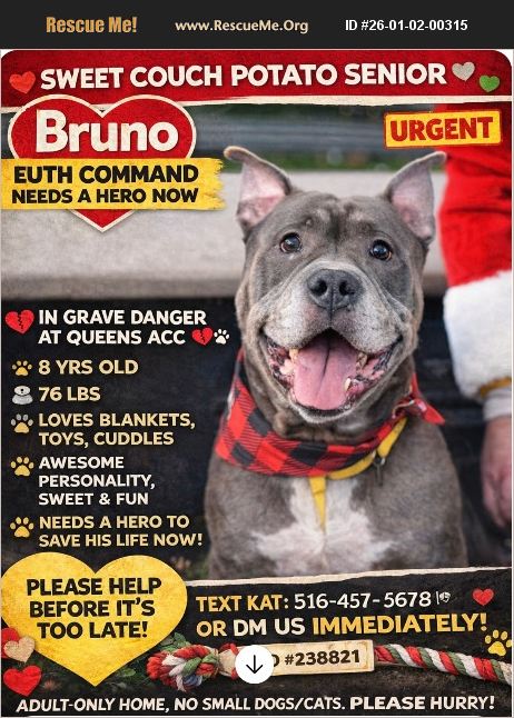 This is a Hail Mary post for sweet senior Bruno that somewhere out there, Bruno's angel is scrolling. A real hero that sees him ! A human who will look at this gray-muzzled, blanket-nuzzling senior and whisper: 'Yes. You are safe with me now.' Bruno has an active euthanasia command at Queens ACC. Meaning he will take his last walk down the hallway and be euthanized. Not because he isn't loved but because the shelter system is overly crowded. The dogs there can smell it. They can sense when others are led away and never return. The noise, the stress, the trauma of losing everything they ever knew it's a world no dog should endure, especially not a senior boy who only wants peace and love. Bruno was surrendered because his guardian became medically fragile and could no longer care for him. That loss broke both their hearts. Now Bruno waits in a place filled with fear, barking, and the heavy scent of goodbye a place where compassion sometimes runs out before hope does. He is described by the volunteers as A senior, sensitive, sometimes shy boy A couch-potato, lazy in the cutest way Solitary and calm at his core Most comfortable in quiet spaces like a bedroom, crate, or soft corner A lover of balls, stuffies, toys-and gentle play Blanket-snuggler and nuzzle-expert A dog who has lived with kids of all ages and done well Smart, vocal, FUNNY, and full of personality A boy who proudly shows off his 'tricks' for snacks: Sit, down, up, paw-repeat! A smushy-faced, elf-eared sweetheart who makes volunteers SWOON The shelter recommends an adult-only home , children 13 and up please with no cats, or small animals due to resource guarding. This boy needs experienced hands and a calm environment, not more stress. He needs a safe landing, not another heartbreak. If you can foster or adopt-please hurry . Bruno doesn't have time left for shares alone. He needs ACTION. He needs a home and his miracle. If you can help this sweet senior boy, text Kat immediately:516-457-3678, I will send you his sweet videos It takes a village, but it only takes one angel to save a life. Be that angel for Bruno. Let 2026 be the year he walks out alive because of one special angel. Bruno ID: 238821 8 years old 76 pounds Large Mixed Breed, Gray/White Queens Animal Care Center (ACC) Euthanasia command active - needs placement NOW Run to the Rescue Where Love and Peace Will Follow