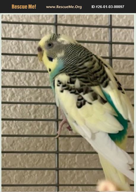 I'm a wonderful parakeet who loves adventure. I can stay in my cage or if I'm let out, I love to fly around the room (watch out for mirrors-I crash into them). My favorite treat in the world is spray millet: when I see you give them to me, I show my appreciation by dilating my eyes.