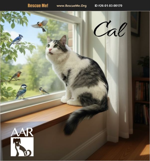 Cal is a sweet, young adult cat. He likes to play with little toy balls that have a bell inside. When he is tired of playing he likes to be picked up and held against your chest.