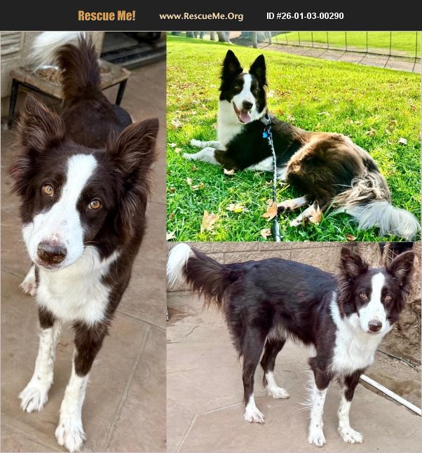 Meet our beautiful border collie Bonnie! She was listed at the shelter as 5yrs old but seems to be much younger. She has a beautiful dark chocolate and white coat and soulful brown eyes and a sweet and fun temperament. She's not destructive in the home, very good with people and dogs. Bonnie is highly intelligent and a very inquisitive girl who will surely steal your heart. She loves adventures outside with you and a perfect best friend wanting to be by your side and one of the best perks, she's already house trained so no starting over with potty training. She's respectful of treats and food with other dogs around but she doesn't seem to like car rides. When the car starts, so does her barking but being in the car is fine, maybe it's something about an engine sound. Bonnie is a loving girl full of kisses but also can be on alert and cautious with some new people she meets, so an experienced dog person who's able to understand her not to be intermediated is required. Bonnie is a wonderful pup who's spayed, microchipped, currenton vaccines. Adored by her foster family, Bonnie is hoping her forever family is reading this! Get your application in ASAP to meet gorgeous Bonnie! Currently being cared for in Southern California, Bonnie can be transported to northern states such as Oregon, Washington, Idaho, Montana, or other locations within the continental United States, where a loving family awaits to welcome the sweet girl.