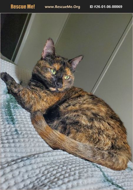 Unfortunately,I'm unable to bring Dekker or her brother Cheech with me. This is the hardest thing I've had to do yet.This beautiful tortie is Dekker and shes 7yrs old. She's sweet but shy. She loves to play with the wand toys but don't expect her to play too long as her stamina is low. Also, she's a terrible jumper. She doesn't always get lift off when she tries. I swear she gets embarrassed if you witness this. She doesn't like loud noises,she will run and hide. She isn't shy to beg when your eating. Especially if it's meat and some cooked veggies. Dekkie has been raised with dogs of all sizes and other cats. She is indoor only. I hope to find her next family.