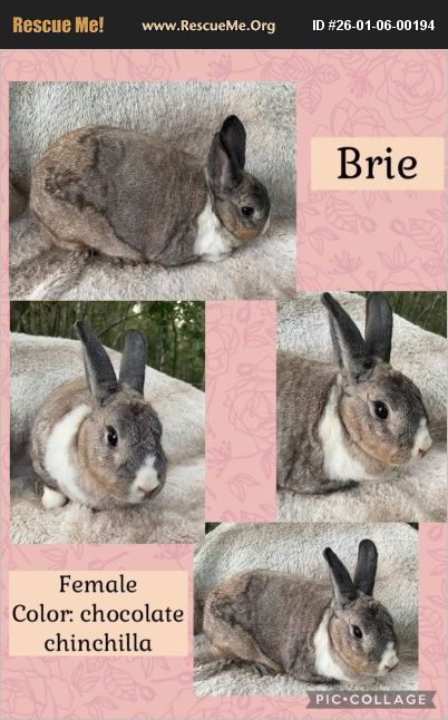 Meet Brie! This beautiful girl was an FFA bunny found abandoned in the barn. No one knew who she belonged to and we were asked to take her in. She is GORGEOUS and so sweet. We believe she is fixed as well. Brie has a very pretty chocolate tint to her. She looks like a chocolate chestnut or chocolate chinchilla in color. I love their white markings. It makes me sad she was abandoned like that.. so we are looking for a forever home for her. She is very friendly and can handle easy, and she loves pets. She gets along with other bunnies as well from what I am seeing. If you were interested in giving this adorable bunny a loving home, please text or call (409)-791-9517 or message the page directly at https://www.facebook.com/TheBunnyHutch22/ Also check out our other available bunnies! At https://www.adoptapet.com/shelter/272325-the-bunny-hutch-hortense-georgia