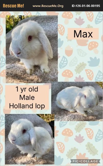 Meet Max.. this cutie is only 1 year old wonderful Holland lop! He is very sweet, easy to handle, and good with other bunnies. He is curious and a fun bunny who would make a great family pet. If you were interested in giving this adorable bunny a loving home, please text or call (409)-791-9517 or message the page directly at https://www.facebook.com/TheBunnyHutch22/ Also check out our other available bunnies! At https://www.adoptapet.com/shelter/272325-the-bunny-hutch-hortense-georgia