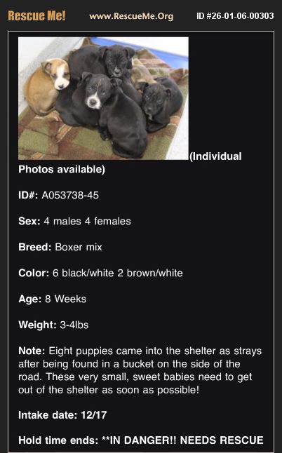 These precious pups were found in a bucket on the side of the road and are now at a rural shelter. We are not sure how long the shelter will keep them and wanted to make a post. They are 8 weeks old and appear to be Boxer mixes. There are 4 females and 4 males. All are too small to vaccinate or spay/neuter, but I can assist with that at the appropriate time. If interested, please text 919 624 0059.