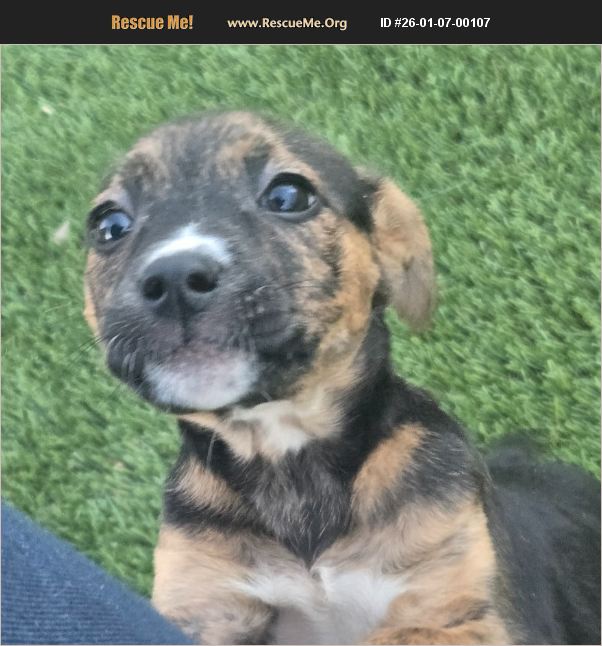 Sienna is a charming puppy with a distinctive brindle and black coat, complemented by adorable tan markings and white patches on her chest and nose. Her bright, expressive blue eyes are full of curiosity, always looking up with a sweet and hopeful gaze.