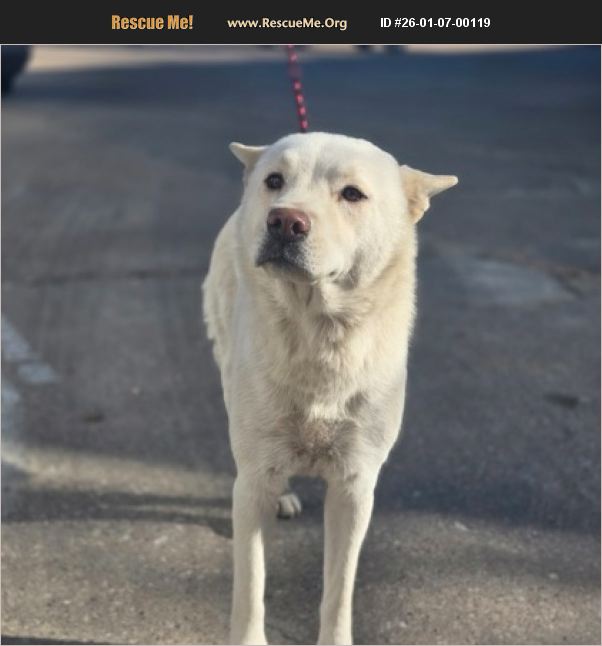 Kenzie is a beautiful, large female adult dog, believed to be a Chow Chow and Husky mix. She has a striking white coat, as seen in the image. Kenzie is looking for her forever home. She is an affectionate and loving companion waiting for someone to express interest in adopting her.