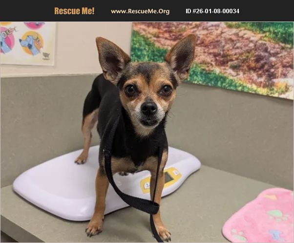 ID#A548324 I am described as a female, black and brown Chihuahua - Smooth Coated mix. The shelter thinks I am about 6 years old. I weigh approximately 6.80 lbs. I have been at the shelter since Jan 07, 2026 and I may be available for adoption on Jan 15, 2026 at 10:00AM.
