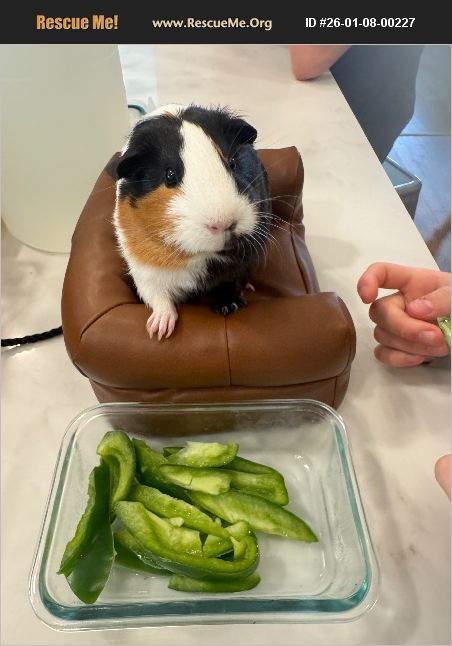 Sweet guinea pig who has been amazing since we took her from a college student who couldn't keep her. One of my sons is allergic . Trying to upload pics but not working. She's an American guinea pig who is black, white and brown. Her name is Honey . Comes with cage, guinea dad pads. House and food