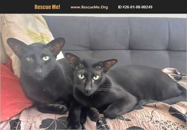 Two darling Oriental Shorthair sisters are in need of a home TOGETHER. They are 5 yrs old, friendly, affectionate & gentle. Please go to soscatrescue.org to read the FAQ first then click on adopt for our application. We will NOT separate them.