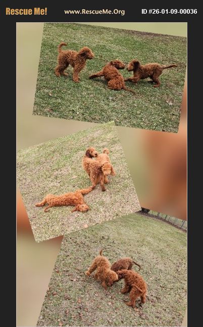 These 3 Irishdoodles have a birth date of 8/18/25. There are 2 girls and 1 boy. They came in to rescue on 1/8/25. When we got the call to pick up these 3 puppies we were told they were the last 3 puppies they had when the owner had broken his leg and could not tend to his chores so his wife was doing them. We did not realize this was when the puppies were 8 weeks old and all this time the puppies had been living in filth out in a kennel/barn. When we arrived to pick them up they were setting in small wire crates in the barn covered in poo and mud. Absolutely heartbreaking to see them or any animal like this. Unfortunately the parents were in the same situation and they wouldn't not allow us to take them with us. We loaded the puppies and brought them back to the adoption center and started their baths. The pictures you see are after their bath. They were so excited to be clean, run free, and have grass to play in. We figured they would be shy and scared of us, but they are happy and sweet. They love their bed in the adoption center and fell asleep like they were definitely living their best life ever. We will try to get better pictures of them once they settle down from the excitement of being clean and happy. Again we did see the parents, mom was an Irish Setter around 45 to 50 pounds and the dad was a miniature cream colored poodle around 13 pounds. These puppies will not be standard size. They will probably be around 30 to 40 pounds give or take. If you are interested in adopting please text or email us to request an application.