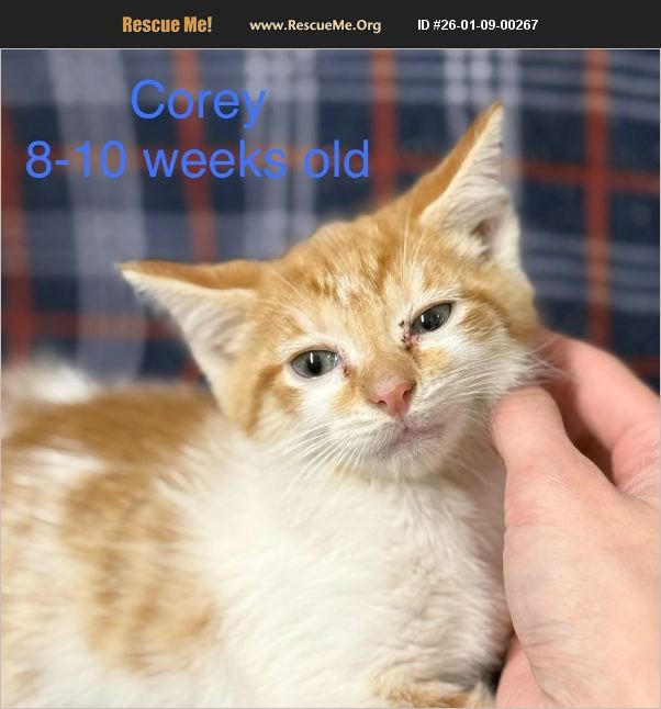 Want to meet ME?* Come to our adoption event this weekend: Sunday, January 11th from 11:30-1:30 Petsmart, 5401 Urbana Pike, Frederick, MD 21704 Only Canines & Kitties Rescue pre-approved adopters will be able to bring a dog/puppy/cat/kitten home from the adoption event. Please apply a few days (or more) ahead of the event to allow time for processing. We hope to see you on Sunday!!! *Dog/Cat attendance is not guaranteed. Feel free to text the event coordinator to confirm a specific dog/cat's attendance: 703-447-4766 IF YOU ARE VIEWING THIS LISTING ON PETFINDER OR ADOPT-A-PET, please visit: Caninesandkittiesrescue.org to access adoption requirements, more information and pictures. Meet Corey! This litter of kittens are socialized, and good with cats and dogs. Kittens MUST be adopted in pairs OR be adopted to a home with another young kitty. They are too tiny and young to live alone as an only cat. This litter is up to date on age-appropriate vaccines, had a full examination by a veterinarian, Combo tested Negative, microchipped and will need to be spayed/neutered by the adopter at 6 months of age. The adoption fee for this kitten is $150, which helps with the cost of routine vet care. A pair of kittens is $275.00 This fee DOES NOT INCLUDE spay/neuter if the kitten is not already spayed/neutered. If the animal you are adopting is not already spayed/neutered, you will be required to sign a contract legally obligating you to have the animal altered. A $100.00 fee will be returned to the adopter once the animal has been sterilized. We will provide information on this process during the approval process.