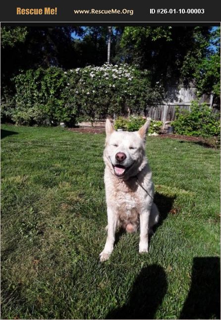 8 year old male white 'Gerberian Shepsky' (German Shepherd & Siberian Husky mix) We have had him as a puppy but we can no longer keep him. High energy smart dog and does best with a very active lifestyle. He's strong and loves hikes. He has been trained to potty in 1 area, sit pretty, stand up, bow, jump up, bark soft/medium/loud, play dead, roll, go in circles, lie down, high five/high ten, shake paw, stay, come, weave through legs.