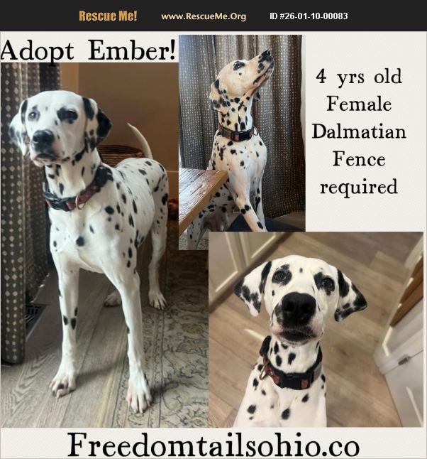 Ember is a sweet timid 4 yr old Dalmatian breeding mama. She is tenative of her surroundings at first but warms up and gives the sweetest kisses. She surprisingly warms up to kids the easiest, which is not always the case with dogs who have had very little socialization. She is most timid with men, but will warm up eventually. She walks well on a leash once she is confident in her surroundings. She is mostly house trained and does great in a crate. She is curious and inquisitive and wants to be a part of everything her foster mom is doing. She can be dog selective, we can't really figure out why. It seems she is just overwhelmed by their attention, and �%BE of our dogs are very interested in any foster that comes to our house. She and our 13 yr old lab pretty much ignore each other. She would do best with a physical fence at least 4 ft high as she is quite agile and easily and gracefully jumps gates in the house, unless her adopter is committed to walking her several times per day. She does not seem to have the high energy her breed is known for but she is also still settling in to life in a home with people who want to love on her. She has not been tested with cats. She is a sweet, sweet soul who is looking for a soft place to land. Apply at freedomtailsohio.com