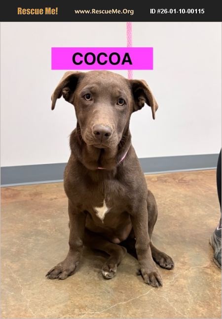 COCOA IS A BEAUTIFUL 5 MONTH OLD CHOC LAB MIX. ABOUT 35 POUNDS. Cute as a button and friendly. Great with other dogs. She is spayed, up to date on vaccines, getting ready for her freedom ride north to Massachusetts. If you want to be her furever, apply at www.sunnypawsrescue.org