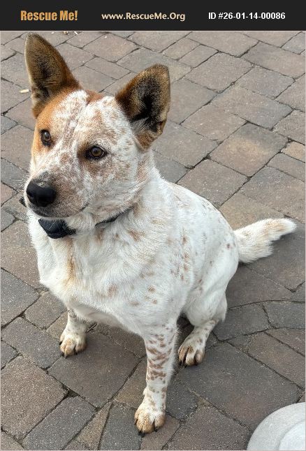 Red Heeler (assume mixed, he 'adopted' us). Predominantly white with rust-colored patches and small spots. About 40 lbs.