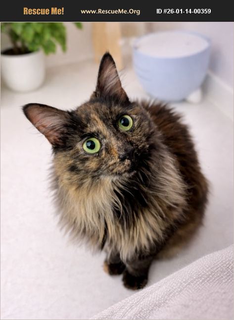 Meet Stevie, a beautiful 5-year-old long-haired tortie with a fluffy coat and striking green eyes. She is a local surrender who was lovingly given up by her family when the dogs in the home began going after her, making it no longer a happy home Stevie. She is now safe and being cared for at our partner, the Happy Cat Hotel in Norwalk, while she waits for her furever family. Despite the changes she's been through, Stevie remains the definition of sweet. She is incredibly loving, affectionate, and thrives on attention. If snuggling were an Olympic sport, she'd take home the gold-she would be perfectly content spending her days curled up beside you, soaking in all the love. Stevie is wonderful with children of all ages, even toddlers, and has the calm, patient demeanor that makes her such a special family companion. While she's mostly sweetness, she does have just a tiny hint of tortie sass that adds to her charm. Because of her past, Stevie is scared of dogs and would do best in a dog-free home. She has never been around other cats, so any feline introductions would need to be slow and thoughtful. If you're looking for a loving, affectionate kitty who wants nothing more than to be adored and return that love tenfold, Stevie may be your purrfect match! Her adoption fee is $225 and Stevie is vaccinated, FIV/FELV negative, microchipped, and spayed. If you're interested in this beauty, please fill out an application at https://form.jotform.com/201805462692153. For questions, email [email protected].