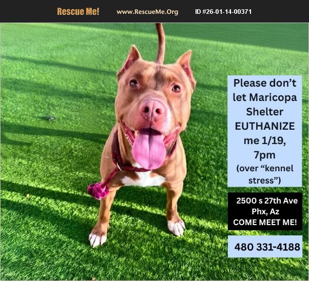 Please help me live! Mcacc Shelter has given me a deadline due to kennel stress. I have done nothing wrong so I hope you come and meet me before my deadline! LOCATED: 2500 S 27th Ave Phoenix Az Fill out: https://www.thedogsavers.org/apply-to-adopt/ Call: 480-331-4188 I'm MIDAS��%BD��%BD%90%BE #A5154592 a 4yr old, 68lb male, Brown/White American Bull Terrier mix. 'I'm chipped, vaccinated & neutered! Yay! * Found as a very friendly * Requirement children 12+; NO cats or small animals. * I love walks, exploring and good on leash- enjoy getting out of the kennel. * I love tennis balls to carry around and keep safe. * I'm nervous and people cautious so patience is helpful. * I love treats and take them nicely when in the mood. * Once I warm up I will enjoy pets and affection please go slow. * I would love a chance at love, Please come meet me!!!