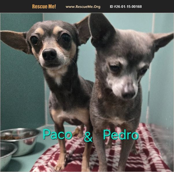 Paco (son) and Pedro (dad) were surrendered together after their owner could no longer care for them. They have never been separated therefore they would need to be adopted together. They are very sweet and do very well with other dogs. Adoption fee is $30 each