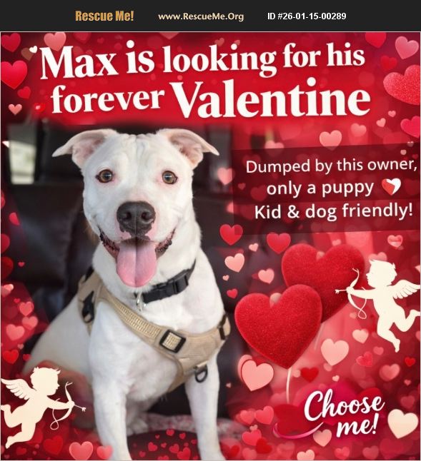 Handsome Max is Searching for His Forever Valentine This post is going out with a prayer that Max's angel is out there somewhere waiting to find him. Sweet Max has been waiting far too long for someone to choose him. He has watched as so many of his friends found loving homes, while he remained behind, overlooked and forgotten. All he wants is to be someone's 'forever Valentine,' to feel safe, loved, and wanted. He is a true love bug with the biggest heart, and he would make the most loyal, devoted companion. Being locked in a cage for most of the day has taken a toll on Max after all he is just a puppy that wants to be free and pmay and run . You can see the sadness in his eyes he is growing more and more depressed each day. His foster is doing everything they can, but they cannot hold him much longer. Shelters are euthanizing daily due to overcrowding, and we are desperate to make sure that is NOT Max's fate. Max's story is heartbreaking. He was dumped by the very person he trusted most, left to fend for himself, and now he is just hoping for a second chance at life and love. At only one year old, Max is still just a baby in so many ways and what a special one he is. There is something truly angelic about white dogs, and Max is no exception a little piece of heaven on earth. Here's what makes Max so wonderful:Housebroken, Well behaved , Walks beautifully on a leash, Dog-friendly (no small dogs), Loves car rides, belly rubs, ice cream, and playing fetch, Gentle, affectionate, and full of kisses Max would do wonderfully in a family with children and has so much love to give to the right people. He doesn't need perfection just patience, kindness, and a family to call his own. Please share Max far and wide. His forever person could be one post away or just maybe it's you Could you be Max's Valentine? If you can foster this sweet puppy boy text Kat 516 457-3678 Run to the Rescue Where Love and Peace Will Follow