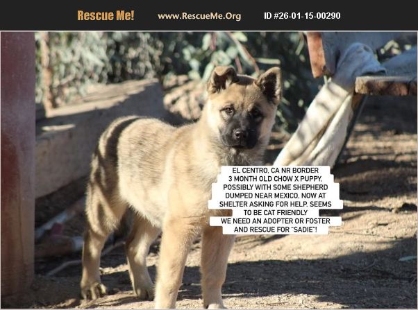 Courtesy posting: EL CENTRO, CA NR BORDER- 3 month CHOW X PUPPY, POSSIBLY WITH SOME SHEPHERD- DUMPED NEAR MEXICO, NOW AT SHELTER ASKING FOR HELP. seems to be Cat friendly WE NEED AN ADOPTER OR FOSTER AND RESCUE FOR 'SADIE'! Humane Society of Imperial County, El Centro, So Cal Sadie - ID #26-0026 This dear young female chow mix puppy was found with a purebred looking momma chow and brought to a remote shelter who contacted us for help, since they rarely have adopters come. Therefore, a foster and rescue is likely needed for each, but either may also be adopted. The shelter let us know the two do not need to go together. Sadie is estimated to be 3 months old, weighs 20 lbs, and more skittish at this time. She is said to be fine around cats, and believed to be part shepherd too from her daddy who is unknown.. We have a separate post up for her momma, Florence (ID #26-0032) who is estimated to be only 1 year old and weighs 43 lbs. The shelter said she is is 'people friendly and dog friendly' . Both dogs have no reported medical issues. For direct adoption inquiries, please call the shelter directly at: 760-352-1911 and reference their applicable ID. The dogs will be spayed for a home. However, please ALSO contact: [email protected] or Southern California Chow Chow Rescue Network who is trying to assist the shelter with his placement, particularly if you are interested in fostering or fostering to adopt- so we can try to pair you with a rescue to help. We will be posting several videos and pictures, as well as updates, on facebook of Sadie: https://www.facebook.com/debbie.alder.14/posts/10168367440573125 Florence's facebook post: https://www.facebook.com/783968124/posts/10168367551888125/?mibextid=wwXIfr Joint facebook post: https://m.facebook.com/story.php?story_fbid=10168367831573125&id=783968124&mibextid=wwXIfr Note: to view contents of link you will need to copy and paste the link into your browser.