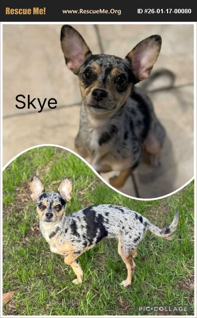 Meet Skye! ��%90%BE Breed: Chihuahua Age: 10 months Weight: 8.6 lbs Personality Snapshot: Skye is a sweet, affectionate little lady with a heart full of love-and a smile that will melt you! She bonds closely to her favorite person and thrives on companionship. While she's initially shy around strangers, she's never aggressive-she just warms up on her own schedule. Good With: Other small dogs (she enjoys playmates her size!) People and older kids Needs to Know: Skye can be intimidated by larger dogs at first but warms up once she learns they're safe. She is not a fan of loud, young children. Leash Training: Her foster mom is working on it�'�| but honestly, it's not going so hot! Secure, physical fencing is a must. Skye is a determined door dasher and will take off if she's spooked or if her person leaves the house. She needs a home where she is either crated or safely contained when unsupervised. Potty trained: Skye needs her person to be with her in the yard-she won't wander alone or go with other dogs. Crate & Alone Time: Will go into her crate willingly with a treat and sleeps quietly through the night. May whine initially when left alone, and longer absences are stressful for her. Best suited for a home where someone is around most of the day. Fun Quirks: Loves food (her true love language!) Enjoys toys she can fit in her mouth Energy level is low to moderate-perfect for snuggles and short play sessions Her smile is irresistible Skye may sound like a handful, but she is truly a charming, loving little girl who thrives with patience, consistency, and a safe, secure home. Adoption Requirements: Home with physical fencing Someone home most of the day Crate or safe playpen for unsupervised times Ready to meet this little heart-stealer? Apply to adopt Skye today! ��%90%BE Adoption Info: All of our animals are fully vetted, which includes spay/neuter, up to date on vaccines, wormed, heartworm tested and treated if necessary, up to date on flea/tick/heartworm prevention, and microchipped prior to adoption. Our requirements are non-negotiable and include the following: All current pets in the home must be spayed or neutered if over 6 months of age, unless there is a documented medical exemption with veterinary confirmation. All current dogs must be up to date on Rabies and Distemper/Parvo (DHPP) vaccinations. All current dogs must be on consistent, consecutive heartworm prevention. Past dogs listed on the application must also show a consecutive history of heartworm prevention. To start the adoption process, please fill out our application here: ���� https://www.shelterluv.com/matchme/adopt/WAG/Dog Please also take a moment to read our requirements located in the application. Please note: The dog you're applying for might already have a meet-and-greet scheduled, be on a trial with another family, or has been offered to another rescue within our network. Don't worry though - we're always happy to help you find another great match if that happens! Our goal is to make sure every pup ends up in the best home for their needs (and yours too!).