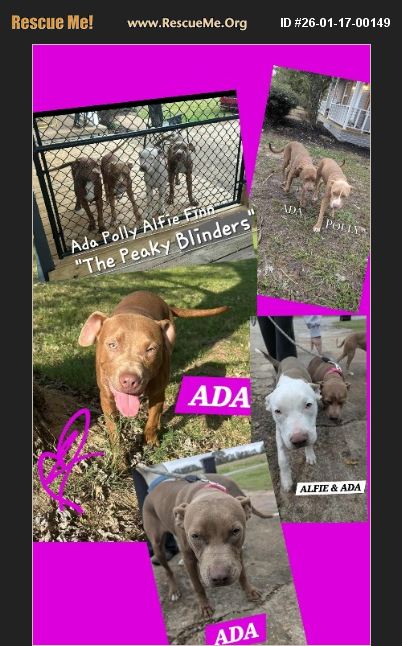 ADA is a great dog. A terrier mix, 15 months, 40 lbs. She has a lovely personality. She and her 3 siblings FINN, POLLY, ALFIE were dropped at a home in West, TN. They are very close and bonded. Wish they could stay together but that will probably be impossible. Fully vetted including spay, vaccinations, 4dx heartworm test and is heartworm clear, getting preventatives monthly. ADA is currently located in Milan, TN. Please contact Lisa at [email protected] or 731-499-0739. Transport out of state can be arranged for an additional cost of $185 which will include a health cert for transport.