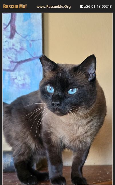 Me Diego he is a big bright blue-eyed boy we are guessing he's either Burmese Siamese or somewhere in the middle. He's about 5 years old he's used to be around big dogs I believe they were called Armenian gampers. His owner used to have about five of them. Unfortunately his owner fell ill and he came to us. Diego is a super friendly big big guy.. but as big as he is he's a little bit submissive I've seen a cat have his size pick on him.. You just wants to be with a human and that's it he wants the attention all the time he doesn't have a mean bone in his body... If you have any questions or would like to meet Diego text Cynthia at 661-603-7744