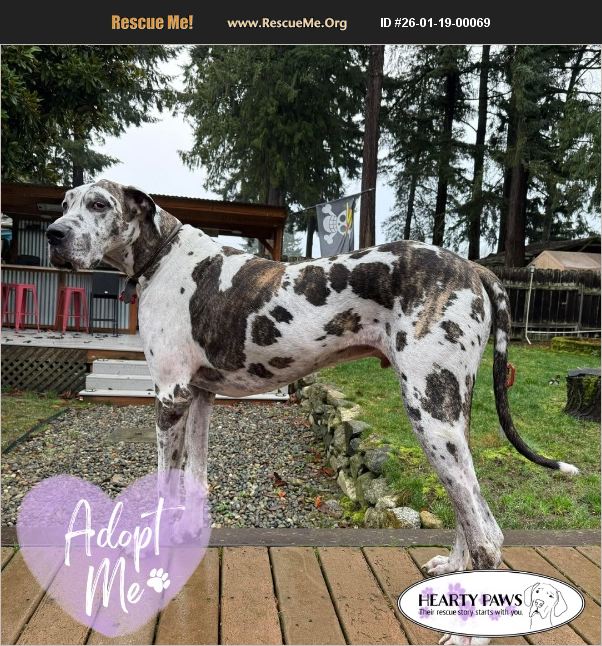 Location: Seattle, WA (adopter must be within 2-3 hours) DOB: 2/26/2021 People love to comment on how big Great Danes are-but Ranger isn't just big, he's a GREAT DANE. Weighing in at an impressive 185 lbs and standing 38' at the shoulders, he's a gentle giant through and through. The bigger the dog, the bigger the love, and Ranger is all about kisses, cuddles, and that classic Dane lean. Despite his size, he truly believes he's a lap dog and will very gently perch himself right beside (or on) you. Ranger is generally calm and easygoing, with occasional playful moments. He loves his people and thrives on companionship. He enjoys regular walks, though he can get overly excited when he sees other dogs or squirrels-continued leash training and guidance with dog interactions will be important, as he's a lot of dog when excitement kicks in. He has lived as an only dog but has done well with visiting dogs in his home. A meet-and-greet with any resident dogs would be required. Cats are unknown. Because Ranger loves being near his humans, he would do best in a home where someone works from home or has a hybrid schedule. Stairs are challenging for him, so a home with minimal stairs is strongly preferred. If you're looking for a loyal, affectionate, larger-than-life companion who will happily lean into your heart (and your space), Ranger may be your perfect match. Apply today! https://forms.gle/G2dJx2NV4JXZcZ9F6