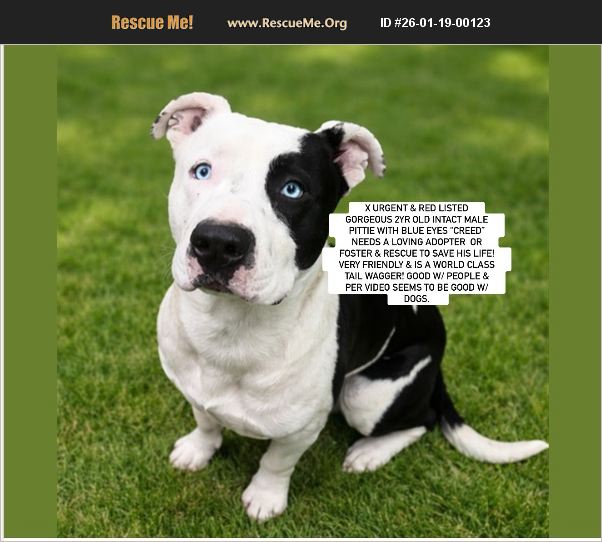 Courtesy Posting: CODE RED - GORGEOUS 2YR OLD INTACT MALE PITTIE WITH BLUE EYES 'CREED' ID #A120503 AT THE HESPERIA SHELTER, HESPERIA SO CAL. NEEDS A LOVING ADOPTER OR FOSTER & RESCUE TO SAVE HIS LIFE! SHELTER IS FULL AND HE CAN BE EUTHANIZED AT ANY TIME FOR SPACE!! PLEASE HELP US SAVE HIM! VERY FRIENDLY & IS A WORLD CLASS TAIL WAGGER! CREED IS ADOPTABLE AND AVAILABLE TO RESCUES. GOOD WITH PEOPLE AND PER VIDEO SEEMS TO BE GOOD WITH DOGS. Creed is a gorgeous young pittie boy with bright blue eyes!!!��%BC If you take a look at his video, you will see he has a very happy tail and is just begging for attention. Please help us save him! I have written to the Shelter and requested his medical and behavior notes, as well as a video of him with other dogs. I will add that information into this post upon receipt. If you are interested in adopting this pup and/or need more information, please call the shelter right away at: (760) 947-1700 and mention his ID number. Note: here is his listing link: https://24Petconnect.com/DetailsMain/HESP/A120503 If you are interested in fostering this pup, please email me directly right away at: [email protected]. I will work to pair you with a good rescue. Note: Rescues need fosters to pull/ save dogs. If you are a rescue, please email the rescue coordinator directly at: [email protected] & [email protected] I will be updating this post with new information from the shelter upon receipt at: https://www.facebook.com/debbie.alder.14/posts/pfbid02rZ8TFPz63bxim6Nqbwiq9ToQoMjqCpTZUBLZEFoGE1V6sVxR5SNZ8JhJYPgCr4H8l Note: to view contents of links you will need to copy and paste each one separately into your browser!